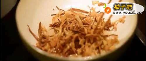 4用黄花菜和豆皮来代替炸腐竹,将其放入炒锅中烧熟后拿出,如下图所示