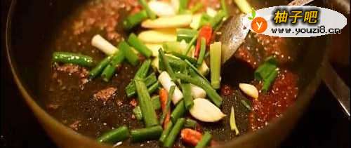 首先将葱,蒜,姜,辣椒等调料加入锅中翻炒,如下图所示