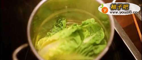 6然后在煮过中放入水,然后等水煮开后,放入青菜,将菜烫熟,如下图所示