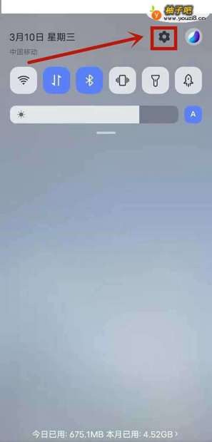 手机下拉屏幕,点击右上角设置图标,如图红色文本框: