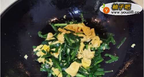 6将韭菜和盐翻炒均匀后,放入煎好的蛋液,调小火翻炒40秒,出锅装盘。