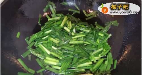 4起锅倒油,油热以后调大火放入韭菜爆炒。