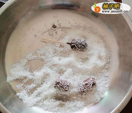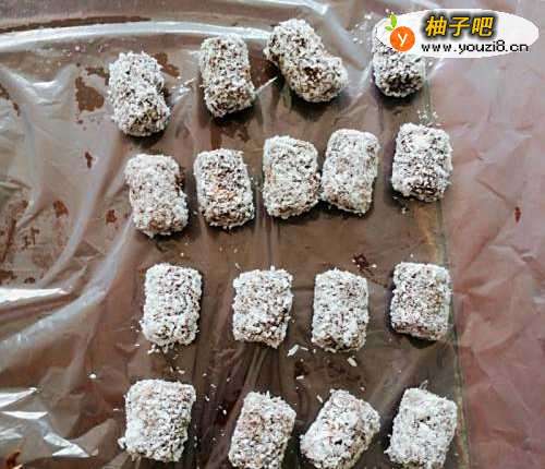 44、然后准备一个浅盘,放入椰蓉,然后将沾了巧克力的棉花糖放入盘中,左右摇晃,直至沾满椰蓉。
