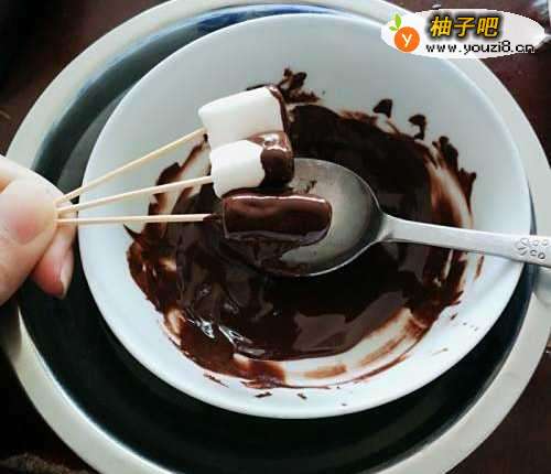 33、棉花糖开始串入牙签,也可以直接扔进碗中,沾满巧克力。
