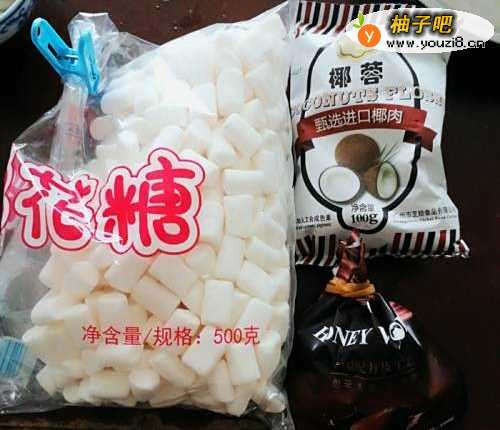 1、准备好椰蓉、棉花糖、巧克力三样材料。