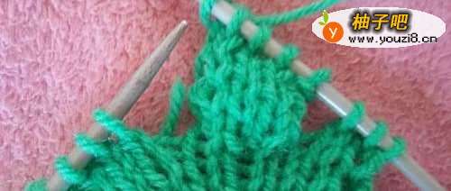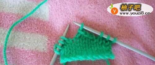 5扣子的织法。我们在扣眼位置相对应的另一片织扣子。在这个位置的三针,从中加出两针,共五针,用平针单织这五针,能够包过扣子,我织了八行,收针。其余织法和扣眼一样,反过来时,在这个位置加三针。