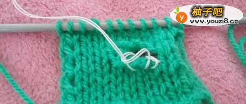 3织物反过来织到我们锁针的地方,再加出三针。方法:用手指绕圈套在织针上。这样扣眼我们就织出来了。