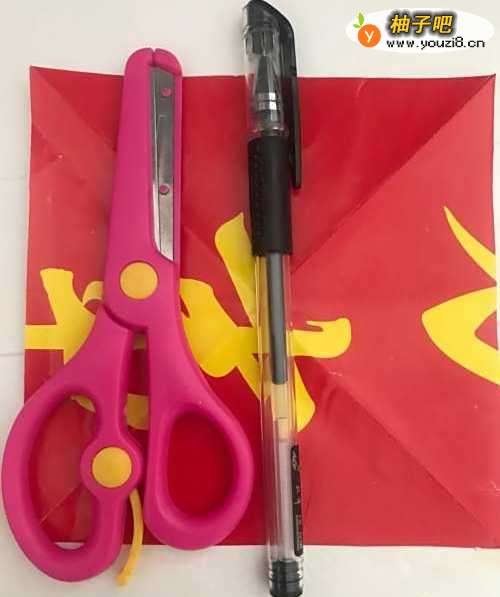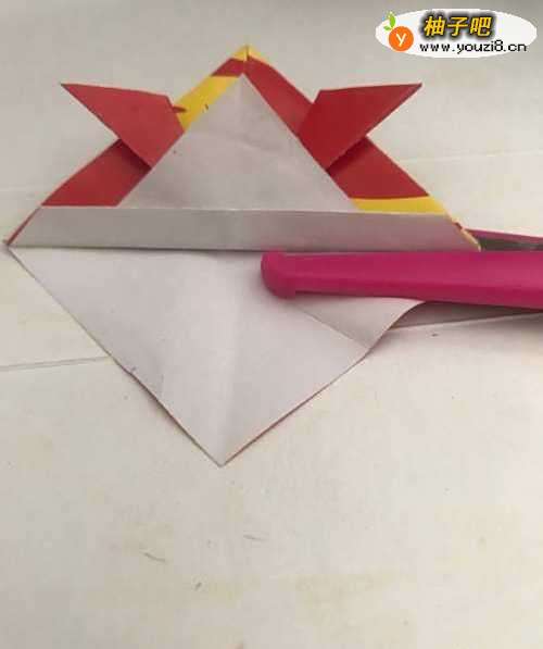 6第六步 单页尖角向上折完之后 下边的那页从中线的左右两端开始向里用手工剪刀剪开 当中留一小段不剪