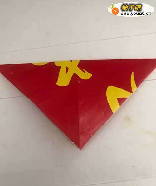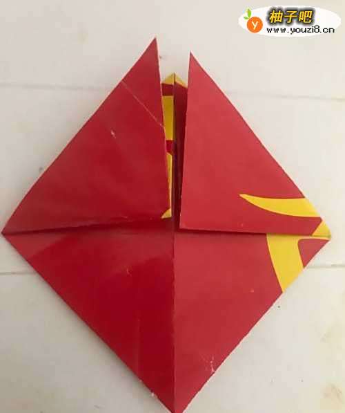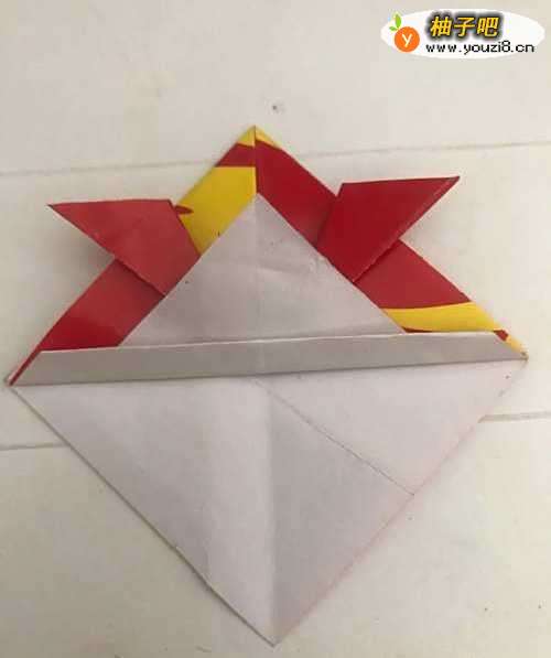 4第四步 下面两个角向上对齐折叠好之后 再把这两个角分别向外倾斜左右对称的折叠一遍