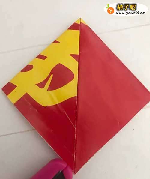 第一步 取一张16长X16厘米宽的正方形双色彩纸 先把它对角摆放 然后再从上向下对角折叠整齐
