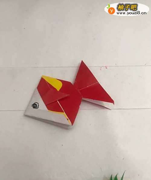 8第八步 折叠一小段之后 再把它取开 向里回折 再把它的鱼尾巴向右翻折 然后再给它画上鱼眼睛 再整理一下 一条漂亮可爱的小金鱼就折叠完成了