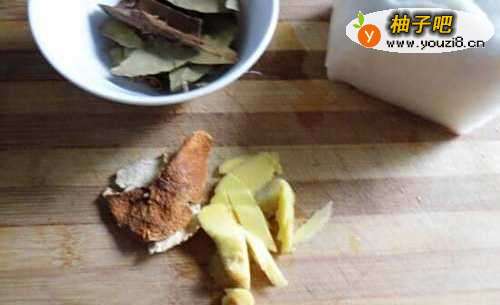 2备好姜片、花椒、八角、香叶、桂皮、陈皮辅料,白萝卜切大块