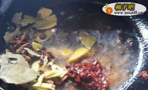 3上油锅,下郫县豆瓣酱翻炒,在下姜片,花椒、八角、香叶、桂皮、陈皮