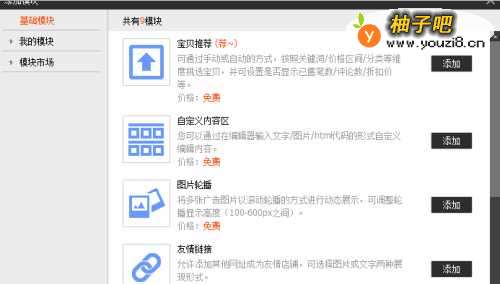 4现在我们返回装修页面,点击中间的位置,添加模块。之后会出现提示框。我们在第二个自定义内容区右侧点击添加按钮。