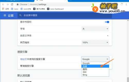 5接着点击箭头处切换地址栏的搜索引擎,选择“百度”。