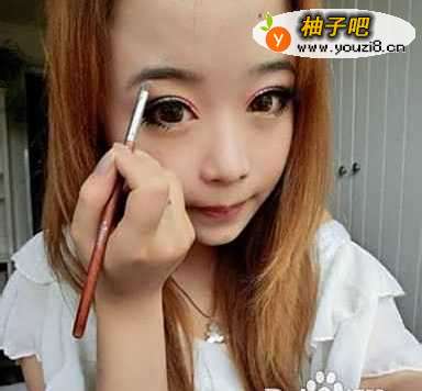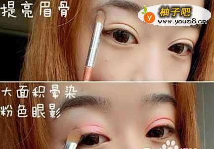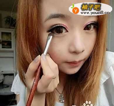 2上眼影,颜色很多,但不宜选太亮的颜色,最好以粉色或灰色为主,注意眼尾要用灰色加深。