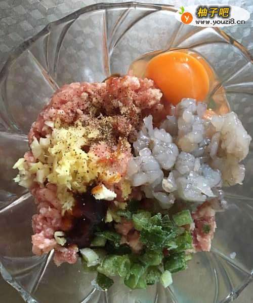 4猪绞肉放在碗里,加入一个鸡蛋,剁好的虾仁,葱姜蒜,盐、耗油,黑胡椒碎以及淀粉。