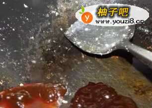5锅里加油加入2勺子甜面酱,然后炒匀加入白糖在炒,.炒匀炒香味出来