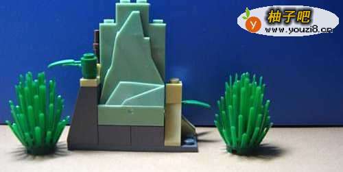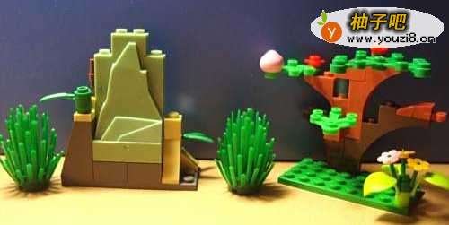 2这里找出一个拼装好的小山和一些植物的积木,作为风景区的背景,摆放的位置,如下图所示。