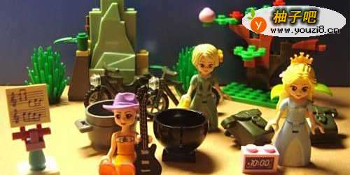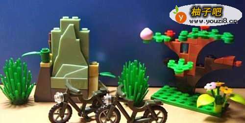 4然后,取出一个拼装好的自行车积木,作为骑车旅行的道具,摆放的位置,如下图所示。