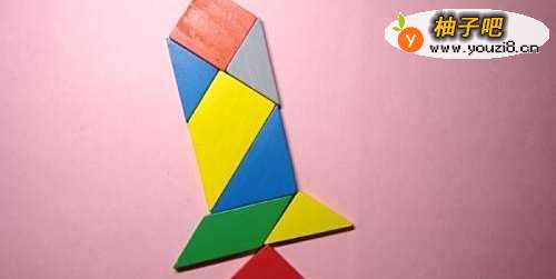 6最后,取红色的梯形板与白色的三角形板连接,并摆放在绿色平行四形板的下边,拼接位置,如下图所示。这样火箭导弹图形就拼好了。可以让孩子仔细看一遍后,自己动手拼图,并不断回忆拼图的顺序,这可以锻炼孩子的记忆能力。培养孩子的过目不忘的能力,对孩子以后的学习有帮助。