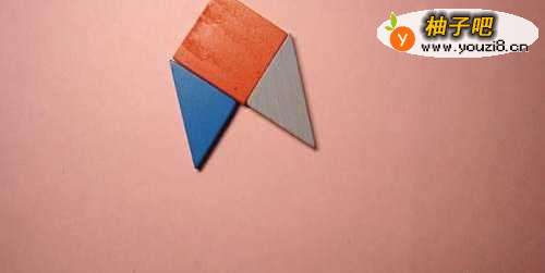 4然后,把橘色的梯形板与蓝色的三角形板连接,并摆放在紫色三角形板的下边,拼接位置,如下图所示。