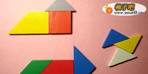 把九巧板准备好,可以每三块拼一个简单图形,先练下手,并数数九巧板的数目是否齐全,如下图所示。