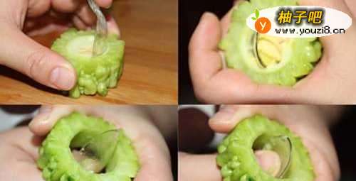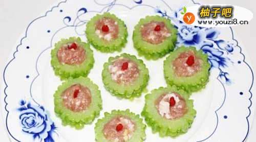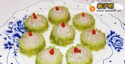 这道菜肉的香味盖过了苦瓜的苦味非常可口。苦瓜酿肉,是先将苦瓜的瓤去掉,再用开水煮熟,浸在冷水里去除苦味,后塞入调好的肉糜,加枸杞点缀,上锅蒸10-15分钟就可以了。