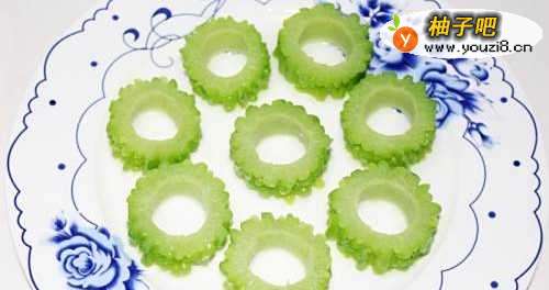 2把苦瓜洗净切成1-2cm左右的厚度。