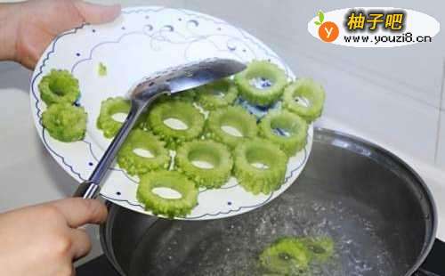 6把处理好的苦瓜倒入滚开的水里煮2分钟,捞出放在冷水里