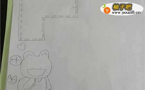 3然后我们再来画位于左下角的青蛙,一起它周围的荷叶,再加上一些心来装饰一下。