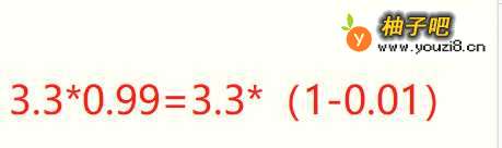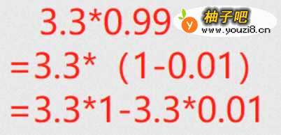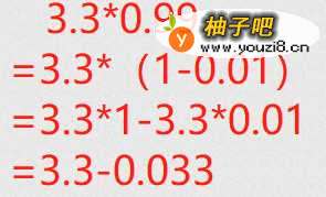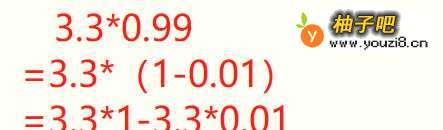 4那么要用乘法分配律的话,我们需要对这个题目的因数进行拆解,其中3.3不好拆解,0.99可以看成1-0.01,那么得到第一步拆解结果