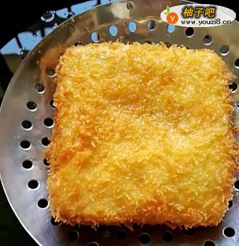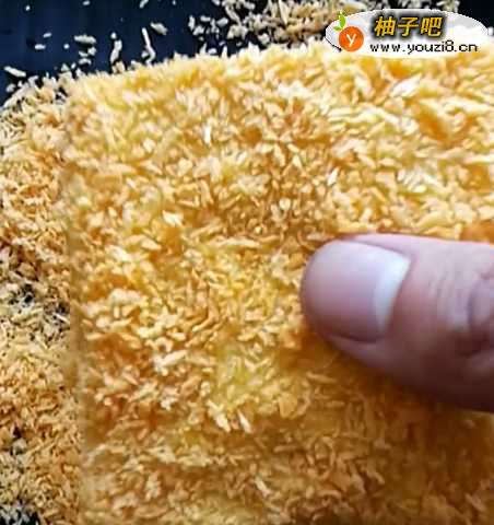 4先沾一层鸡蛋液,再沾上一层面包糠,油温5-6成热,下入锅中;
