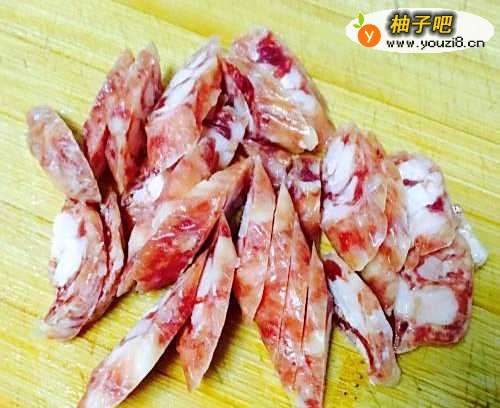 2香肠直接从冷冻里取出来切成片备用,蒜瓣也切成片待用。