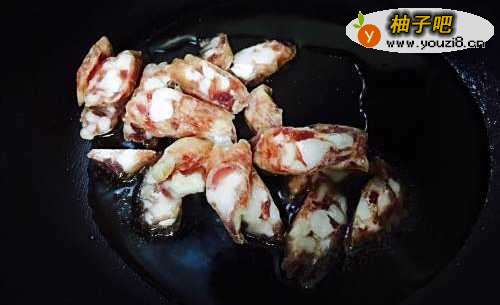 5锅烧热,倒入少许色拉油,油热之后放入香肠,先把香肠的油脂煸炒出,接着放入蒜瓣煸香。