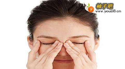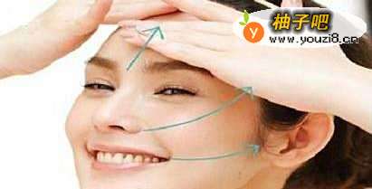 额部按摩:双手中指揉攒竹穴(眉内侧的凹陷处)、印堂穴(两眉头连线中点),慢慢上推至发际按压至太阳穴点揉,可防治额部皱纹、头痛。