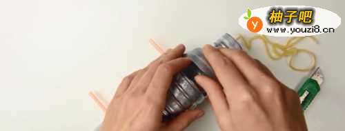 2在瓶身两侧分别扎两个孔。车轴要从孔中间穿过去,所以对应的孔之间应该齐平。