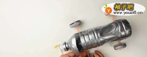 6将车轴穿过瓶身。车轴可以是两根或四根,看你选什么材料。长的车轴就直接从瓶身一边穿到另一边;短的车轴,比如牙签之类的,就每个孔都穿一根。