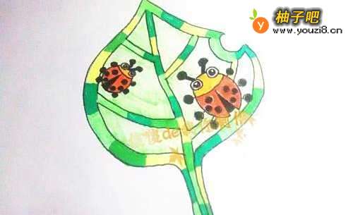 7我们用一个很浅很浅的绿色彩铅,将叶子纹路里面的白色部分填涂满。这个时候叶子和瓢虫基本就画好了。注意:没有绿色彩铅的,可以用绿色不是很显色的水彩笔填涂,只需轻轻几笔就能够显示出叶子里面淡淡的绿色。因为水彩笔到后期会有点不显色,这时候就可以废物利用了。