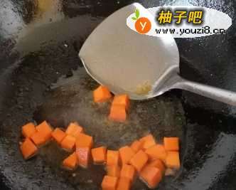 5原锅下胡萝卜丁,加盐,加少量水焖一下至熟
