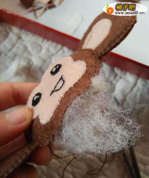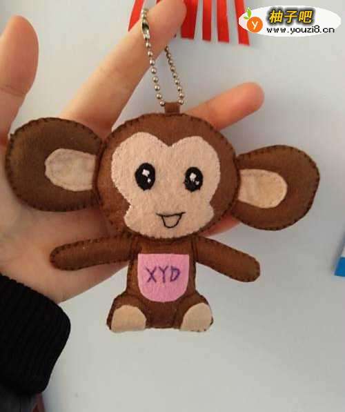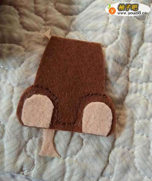 6接着我们把另一片脑袋的不织布和前边的缝合在一起,从小猴的脖子开始起针,在缝耳朵的时候我们用的是回针针法,缝到头顶的时候,我们剪一小长条用来做挂绳,一起缝上就可以了。