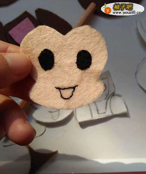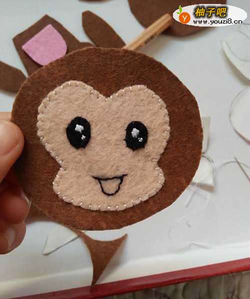 3首先我们缝制小猴的眼睛和嘴巴,眼睛我们用贴布针法缝制,也可以直接用酒精胶粘住,嘴巴事先在布上画好形状,然后用回针缝制。我们再用白色的线使用回针针法在黑色的眼睛里缝制出高光来。