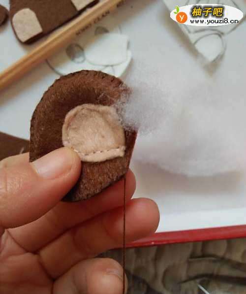 4我们把缝制好的猴子脸放在脑袋上用贴布针法缝制后,先放在一边。我们开始缝制猴子的耳朵,记得要留出口来方便放丝绵。