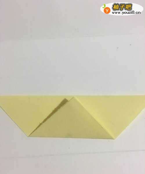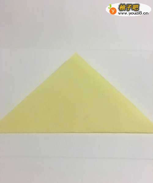 第一步 把一张16厘米x 16厘米的正方形黄色彩纸 从下向上对角折叠