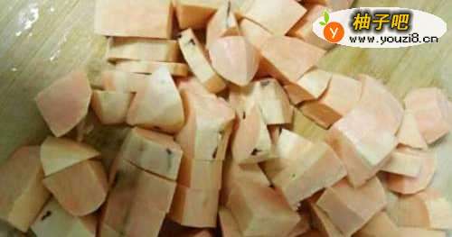 2将红薯的皮削掉,切成如图所示的一小块一小块的后,用水冲一下,去掉部分的淀粉。备用。