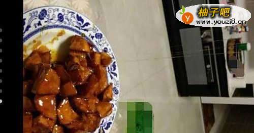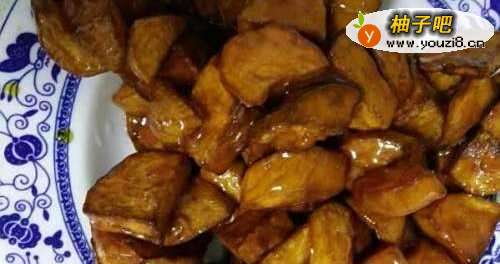 6这个时候,将糖浆洒在先前炸好的红薯块上,一盘非常美味的拔丝红薯就做好了。看看,丝多长啊!