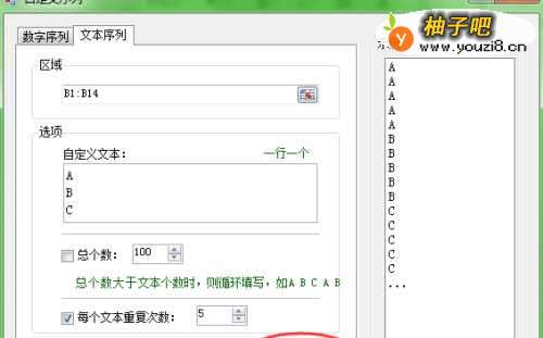 4【自定义序列】对话框→【文本序列】区域选择B2:B14→【选项】勾选“每个文本重复次数”输入”5“,单击【确定】。