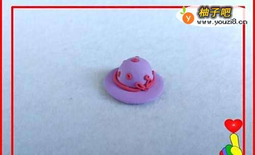 7再取红色彩泥适量,滚搓一根细长条,粘合在帽子接合处,作为装饰。追杰