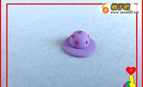3再取蓝紫色彩泥适量,滚搓成小圆球,再捏制成半圆球的形状,作为“帽顶”。