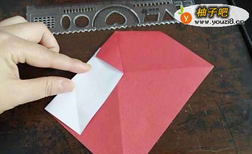 3把彩纸翻到另一面,把两侧的边向内折,再把上边的角向下折,如图所示。